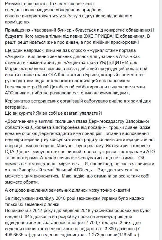 Константин Брыль ответил на публикации «Акцента»01.10.2019 ![]() Экс-глава Запорожской ОГА Константин Брыль прокомментировал ряд последних публикаций в СМИ, в частности и материалы нашего сайта «Акцент». Речь идет о материале Як Бриль та запорізькі опоблоківці заробили 11 мільйонів на онкодиспансері, — СБУ веде справу, а также о статье В Запорожье под геокадастром митинг АТОшников: скандальную чиновницу отстранили (ФОТО, ВИДЕО). В первой статье речь шла о расследовании СБУ и решении Жовтневого райсуда Запорожья относительно завышении почти 11 миллионов гривен при закупке линейного ускорителя для онкодиспансера. Первоисточником выступал сайт «Наші гроші Запоріжжя». Ранее сам Константин Брыль активно освещал тему закупки этой техники, инициировал и проводил рабочие совещания на эту тему. По информации «Акцента» продвигали тему закупки именно Константин Брыль совместно с руководством запорожского Оппоблока, в частности Ярославом Крылем. Последний, к слову и возглавлял временную контрольную комиссию по разработке программы улучшения материально технического оснащения областного онкодиспансера, которая и фигурирует в уголовном производстве. Во втором материале — о прямой речи лидера одной из ветеранских организаций запорожских АТОшников Игоря Маринюка, который упомянул Константина Брыля в части не выделения земельных участков для учатсников боевых действий. Экс-гебурнатор прокомментировал данные публикации, посчитав их «заказными» и такими, а подачу материала такой, что не соответствует действительности. Брыль считает, что неустановленное должностное лицо ОГА, о котором идет речь в постановлении суда — это вовсе не он. Приводим фото с текстом поста в Фейсбук Константина Ивановича. ![]() Напомним, сейчас НАБУ расследует дело против Константина Брыля. Экс-главу Запорожской ОГА обвиняют в скрытии реальных доходов. Ранее СМИ неоднократно писали о том, как семья Брыля, всю жизнь проработавшего на госслужбе, посещает дорогие курорты и живёт «на широкую ногу» Источник: akzent.zp.ua * Редакция сайта не несет ответственности за содержание материалов. Мнение авторов может не совпадать с мнением редакции. |