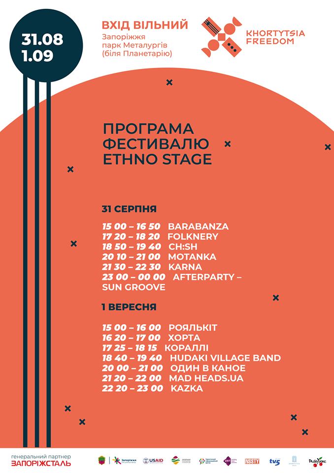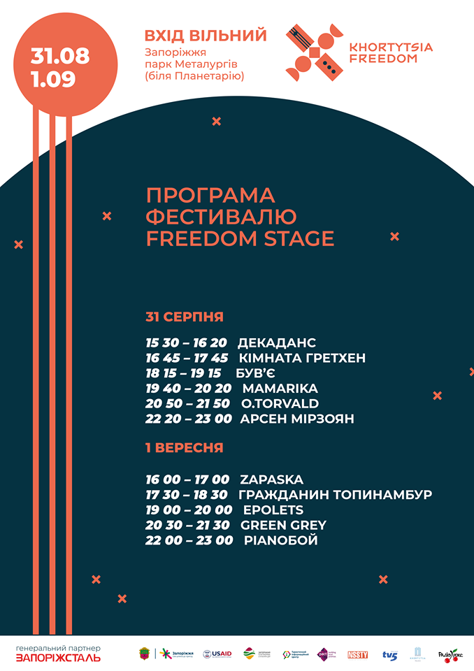 Khortytsia Freedom-2019 продлится два дня. Здесь, 31 августа и 1 сентября, выступят более 30 разноплановых артистов. Фестиваль также порадуетсвоих гостей фуд-зоной от лучших заведений, детскими локациями и бесплатными экскурсиями по Хортице.