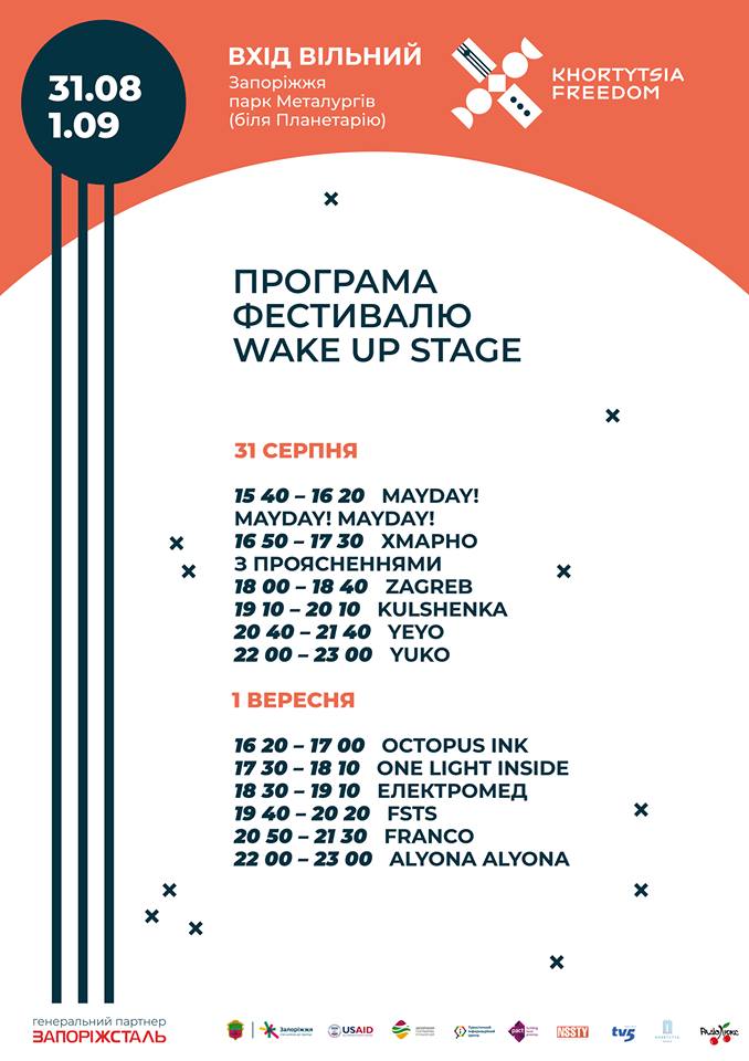 На Wake UP Stage выступят молодые артисты, которые отличаются нестандартным звучанием. Все они развивают украинскую музыку в современном направлении. На этой сцене будут зажигать молодая рэп-певица Alyona Alyona, рок-группа Franco, столичная инди-группа «Хмарно з Проясненнями» и другие.