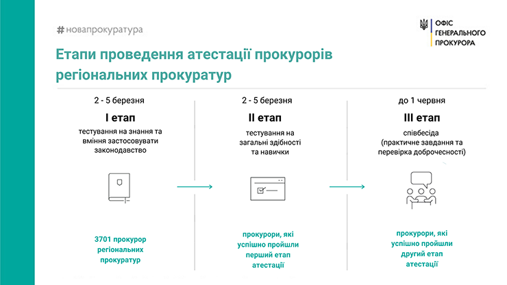 Первый и второй этапы аттестации пройдут со 2 по 5 марта 2020 в Киеве. Для обеспечения непрерывности работы региональных прокуратур, прокуроры с одной прокуратуры сдают экзамены в разные дни.
