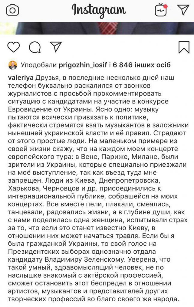 «Если бы я была гражданкой Украины, то свой голос на выборах однозначно отдала бы кандидату Владимиру Зеленскому», — написала Валерия в своем Іnstagram.