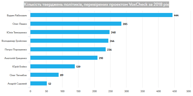 1962 перевірених висловлювання, більше половини в них — маніпуляції, брехня та перебільшення. Таким є підсумок проекту «Рейтинг маніпуляторів та брехунів» за 2018 рік. Весь рік фактчекінговий проект VoxCheck перевіряв висловлювання очільників держави та політиків, які лідирують в соціологічних опитуваннях до президентських та парламентських виборів. Сьогодні більше половини з них — Петро Порошенко, Юлія Тимошенко, Олег Ляшко, Анатолій Гриценко, Юрій Бойко, Андрій Садовий, Володимир Зеленський — мають президентські амбіції. Вадим Рабінович та Олег Тягнибок збираються вести свої політичні сили на парламентські вибори. Політична доля Володимира Гройсмана поки що невідома, але очевидно, що за бортом корабля під назвою «українська політика» він не залишиться. Святослав Вакарчук не йде в президенти, але осторонь залишатися не збирається та «разом зі своєю командою працюватиме над тим, щоб проєвропейські сили перемогли».
