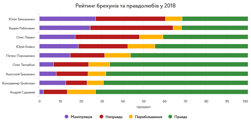 Дисклеймер. Цей рейтинг було складено за результатами 2018 року, і до нього не потрапили заяви політиків 2019 року. Ми усвідомлюємо, що для деяких політиків активна фаза передвиборчих перегонів почалася саме цього року, а відтак змінилася їхня риторика. Висловлювання за 2019 рік будуть проаналізовані в окремих матеріалах проекту VoxCheck поза рамками проекту «Рейтинг маніпуляторів та брехунів» у лютому та березні 2019 року. Методологія відбору цитат політиків для рейтингу, перевірки та розрахунку — в кінці цієї статті. Інформацію про відсотки правди та неправди у виступах політиків можна подивитися на графіку. У статті ми описуємо риторику політиків у 2018 році та основні помилки та маніпуляції в їхніх промовах.