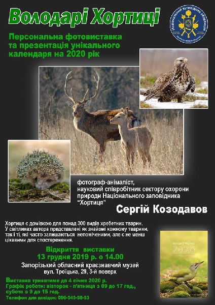 Выставку «Володарі Хортиці» и одноименный календарь Сергей Козодавов презентовал в областном краеведческом музее. В экспозиции — 29 фото животных, живущих на легендарном острове. Сергей Викторович рассказал «Индустриалке», что сделал их за последние пять лет. В своих работах автор акцентирует внимание на том, что в природе нет неинтересных, ненужных животных. Поэтому в фотографиях, представленных на выставке, постарался показать красоту как всем известных животных, так и тех, которые остаются практически незаметными для людей. Но всех их объединяет то, что именно они являются настоящими хозяевами Хортицы, ведь этот остров на протяжении тысяч лет является домом для сотен видов животных. Характерной чертой творчества Сергея является склонность к крупноплановой, даже портретной съемке птиц и животных. Он уделяет большое внимание передаче мельчайших деталей их внешнего вида и особенностей поведения.