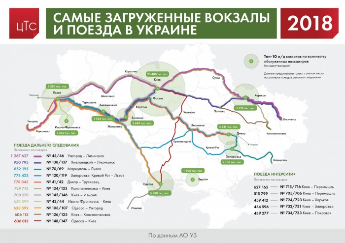 В тройку лидеров попали вокзалы Львова с 8283,5 тыс. пассажиров и Харькова, который обслужил 5712,2 тыс. пассажиров. Замыкает десятку лидеров ж/д вокзал Херсона. Там обслужили 1506,7 тыс. человек.