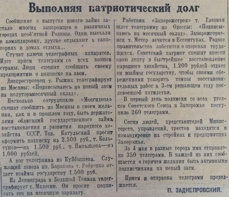 На Днепрогэсе «не успел диктор закончить чтение правительственного сообщения о выпуске нового займа, как началась подписка». Все днепрогэсовцы подписались на заём за два часа.