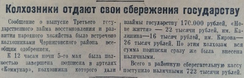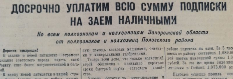 В 1948 году на долю займов пришлось 24% доходов госбюджета. Вот так подставили плечо возрождающейся стране ее многострадальные трудящиеся. А колхозники тогда, кстати, работали за трудодни, но «Большевик Запорожья» всячески подчеркивал, что сельчане дают взаймы государству наличными.