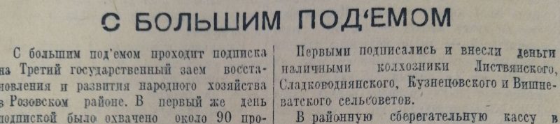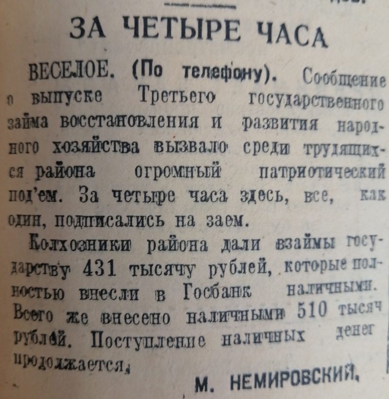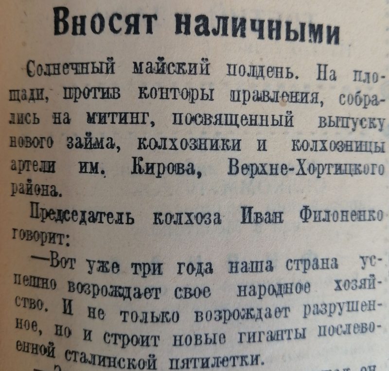 «Диктор еще продолжал читать условия выпуска нового займа, а в Пологском кондукторском резерве стало уже шумно». И оцените, до какого цинизма дошла газета в следующем предложении: «Все спешат первыми подписаться на заём».