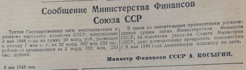 Правительство хотя бы ради приличия не удосужилось выдержать паузу после торжественных речей о счастливой жизни и нахально выдало свое постановление уже 3 мая 1948 года. Этот заём не был первым и не был последним, такой же подарочек свалится на людей и ровно через год – 3 мая 1949 года.